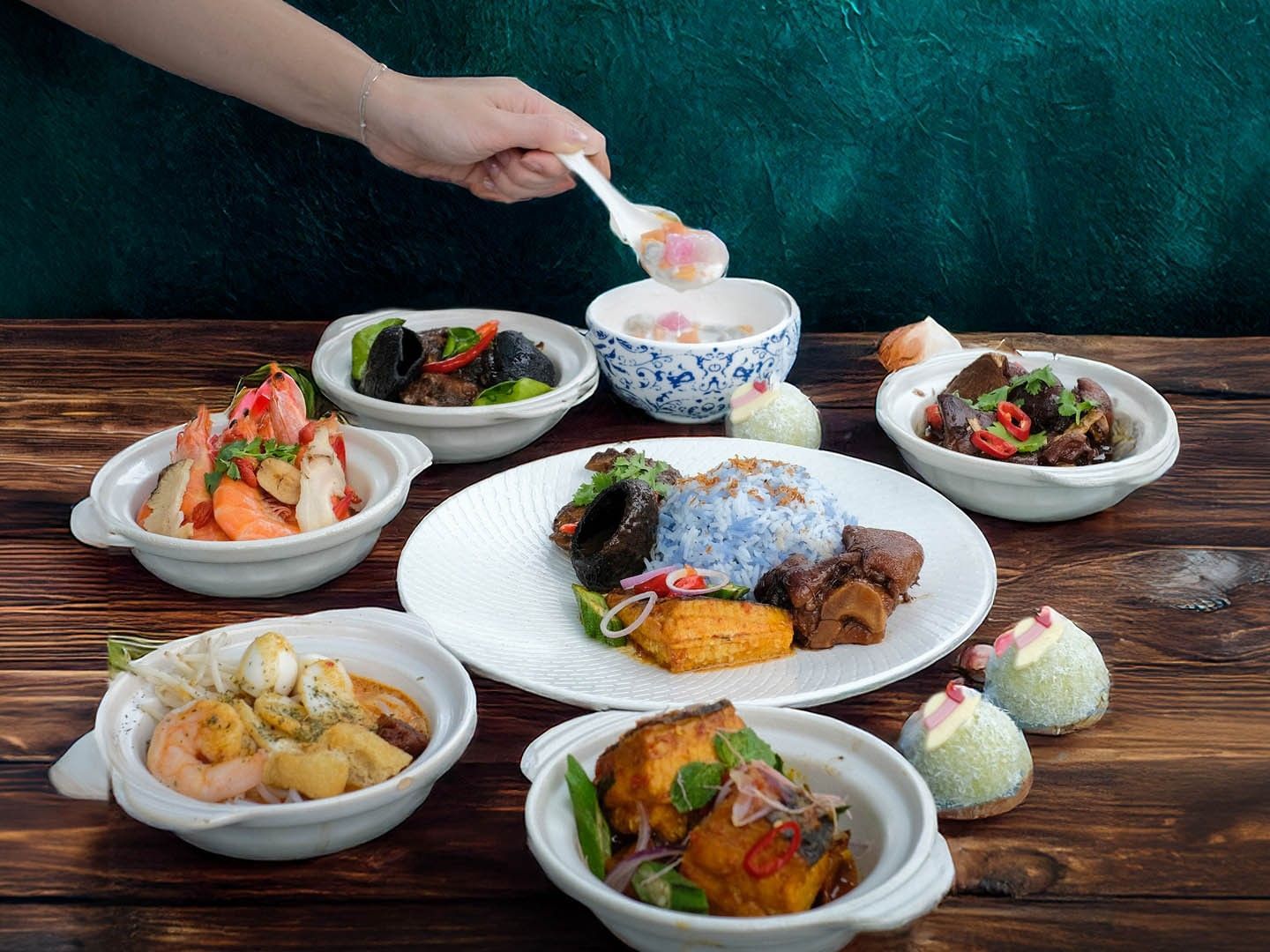 Promotional image of a colorful Weekday Set Lunch, featuring Nasi Kerabu, curries, and side dishes served at One Farrer Hotel