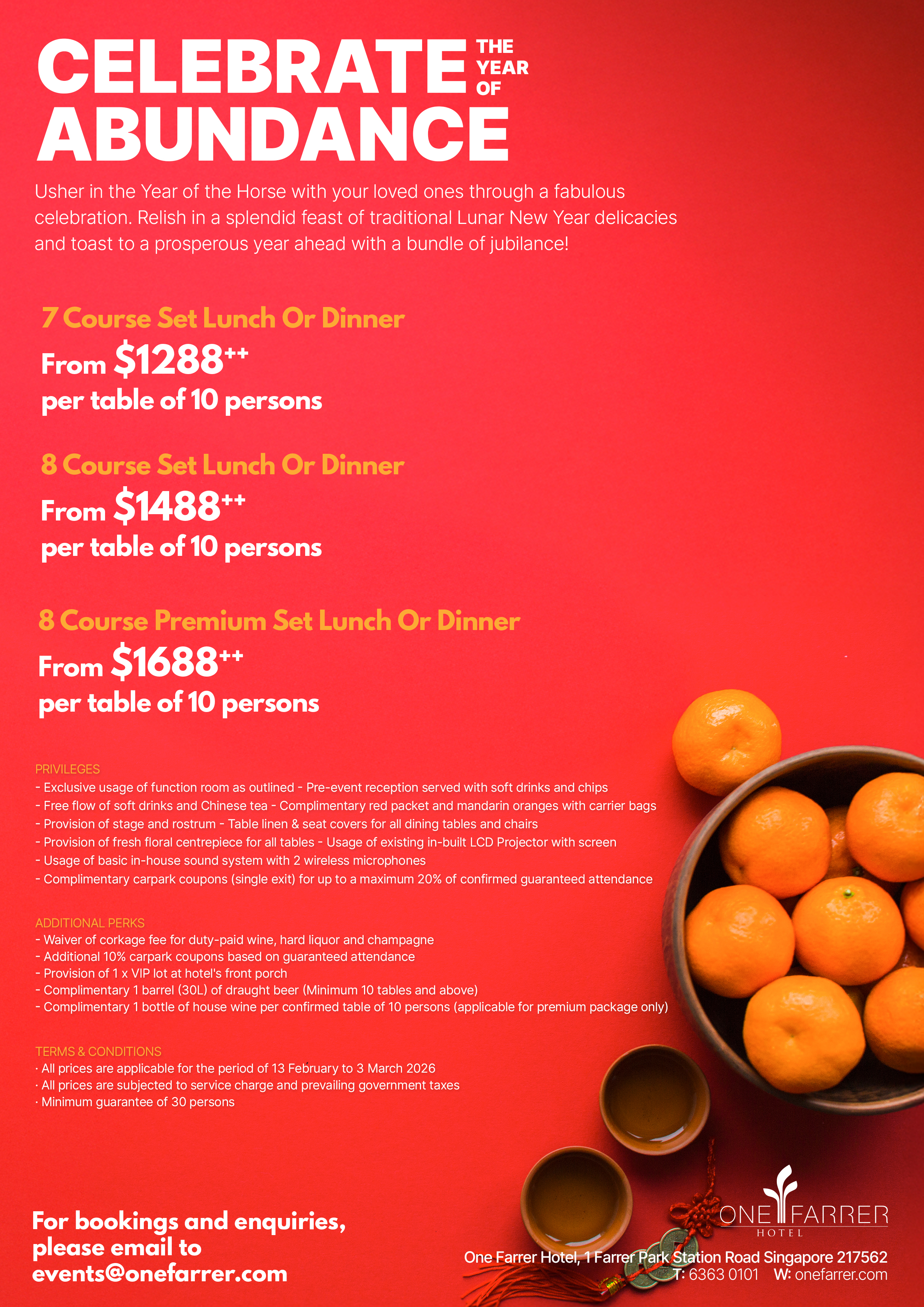 Share the joy with your loved ones and celebrate your baby’s full month at one of our splendid function rooms with our thoughtfully curated Blessed Full Month package featuring a wide selection of dainty bites, drinks, auspicious red eggs and ‘ang ku kueh’. Our dedicated event planner is also well-versed in planning birthday bash including a meaningful and grand celebration for your well-aged loved ones with an artfully plated display of auspicious longevity buns and more!